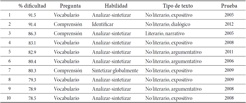 Al revisar hasta la pregunta 7 (que es hasta donde llegan las preguntas más fáciles, es decir, con una dificultad superior al 80 por ciento), se aprecia que no hay tendencias muy marcadas; sólo destaca el hecho de que seis corresponden a textos no literarios; hay cuatro ítems de vocabulario y tres de comprensión, lo que demuestra una distribución bastante similar; tres de estas siete preguntas corresponden a textos expositivos, las otras cuatro se reparten en una variedad de tipos textuales.