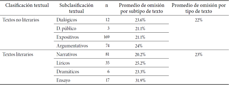 los dos tipos de textos que muestran una omisión más elevada son literarios: ensayísticos, con un promedio de omisión de 31.9 por ciento; y líricos, con un 25.2 por ciento;