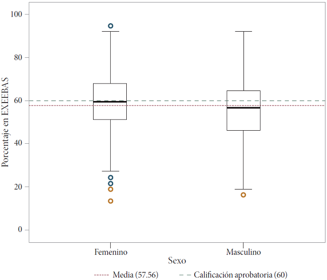 Las diferencias por sexo se presentan en la Gráfica 1. Al analizar la puntuación máxima, ambos sexos tienen puntajes similares. Para el caso de la puntuación mínima, los hombres obtuvieron puntajes más bajos en comparación a las mujeres. Por otro lado, más de 50 por ciento de las mujeres lograron una calificación arriba de la media, mientras que 50 por ciento de los hombres se situó por debajo. En cuanto a la dispersión de las puntuaciones, las de las mujeres fueron menos dispersas que las de los hombres.