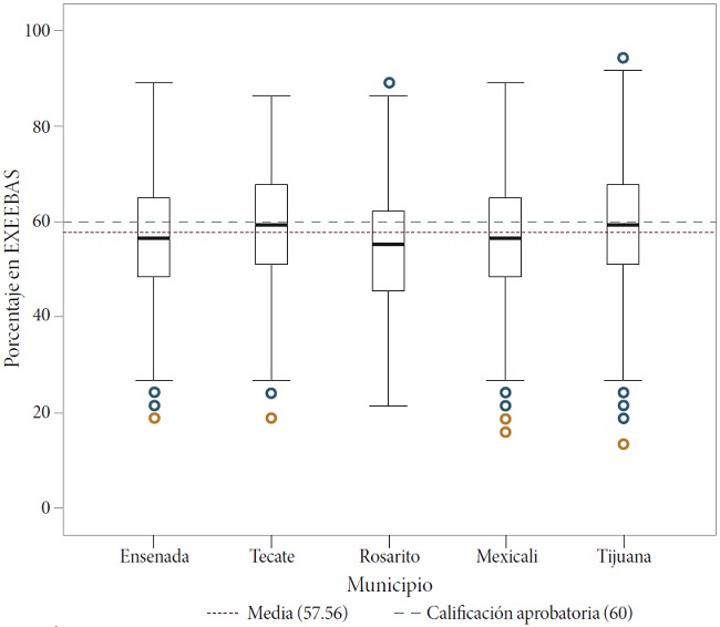 Por otro lado, al relacionar la puntuación obtenida en el EXEEBAS con algunas variables de contexto como sexo, municipio, modalidad, turno y edad, se identificó que los estudiantes con un mejor desempeño tenían las siguientes características: a) eran mujeres; b) cursaban la secundaria en el municipio de Tijuana; c) asistían a secundarias privadas; d) estaban inscritos en el turno matutino; y e) presentaban la edad normativa, es decir, entre 14 y 15 años. En contraste, los estudiantes con las puntuaciones más bajas presentaron las características siguientes: a) eran hombres; b) vivían en Playas de Rosarito; c) asistían a telesecundarias; d) cursaban la secundaria en turno vespertino; y e) tenían 16 años o más.