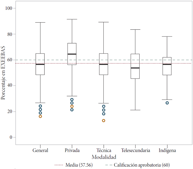 Debido a que el EXEEBAS es un examen alineado al currículo, y éste evalúa los conocimientos al egreso de la educación básica, el examen se aplicó a estudiantes de tercero de secundaria. Asimismo, se fijó en 6.0 la calificación aprobatoria (en escala de 0 a 10), ya que es el mismo puntaje que utiliza la SEP para considerar la aprobación o no de una asignatura. En relación con las propiedades psicométricas del EXEEBAS, presentó un Alpha de Cronbach de .665 (Cantú y Rodríguez, 2018).1