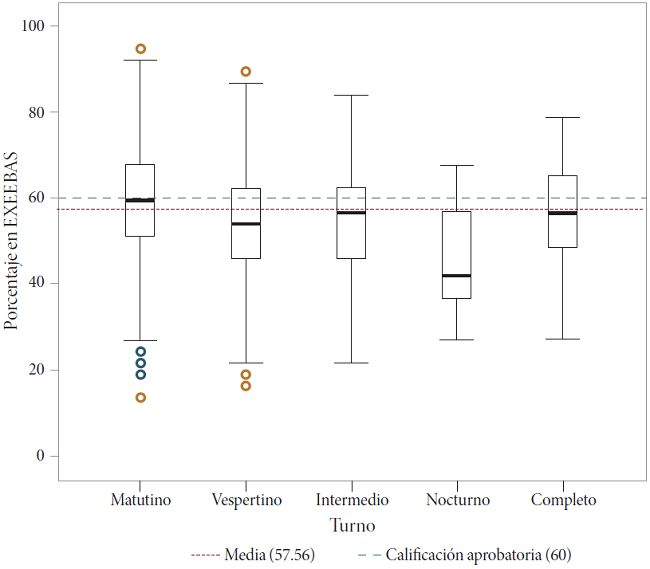 Una vez obtenidos los análisis descriptivos básicos relativos al EXEEBAS, se procedió a relacionar los puntajes con variables de contexto como sexo, municipio, modalidad y turno escolar. Cabe mencionar que, para fines de una mejor interpretación, la proporción de aciertos de los estudiantes en el examen se muestra en porcentaje.