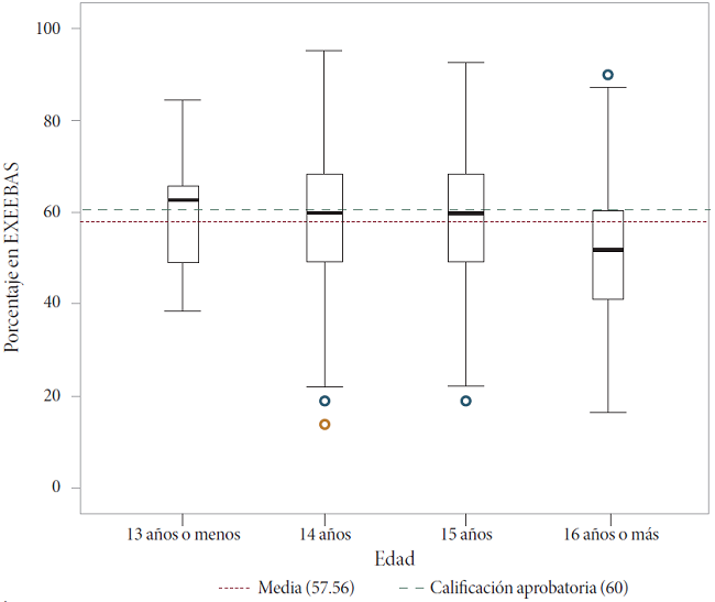Por último, respecto de las diferencias por edad, en la Gráfica 5 se aprecia que los estudiantes de 14 años obtuvieron una mayor dispersión en sus puntajes y consiguieron las puntaciones más altas: más de 50 por ciento de los jóvenes con 13, 14 y 15 años se colocaron por encima de la media; en contraste, los estudiantes de 16 años o más resultaron con los puntajes más bajos, ya que casi el 75 por ciento se situó por debajo de la media. Los jóvenes con 13 años o menos consiguieron puntuaciones menos dispersas y fue el único grupo etario con un mayor número de estudiantes con un porcentaje aprobatorio, es decir, mayor a 60 por ciento. Cabe mencionar que este grupo estuvo conformado solamente por 11 estudiantes.
