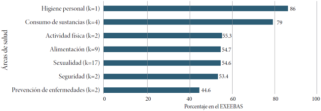En cuanto a las diferencias de los porcentajes de aciertos en el EXEEBAS en cada una de las áreas identificadas, higiene personal fue el área en la cual los estudiantes demostraron, en promedio, mejores resultados. Este hecho no sorprende, pues dicha área está presente desde preescolar hasta secundaria, a diferencia de otras, como prevención de enfermedades y sexualidad, que están presentes a partir de cuarto de primaria (SEP, 2011a). El área de prevención de enfermedades fue la que más respuestas incorrectas registró por parte de los examinados, lo cual se puede deber a que son contenidos complejos, ya que incluyen muchos conceptos, habilidades y valores en un solo aprendizaje esperado. Este tipo de contenido generalmente pertenece a la asignatura de Formación cívica y ética (SEP, 2011a).