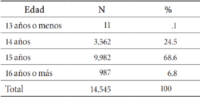 Dado que la edad normativa para tercero de secundaria es de 14 y 15 años, en la Tabla 1 se muestra la distribución por edad de los participantes.2 Al momento del estudio, la mayoría se encontraba en edad normativa y sólo 6.8 por ciento tenía 16 años o más.