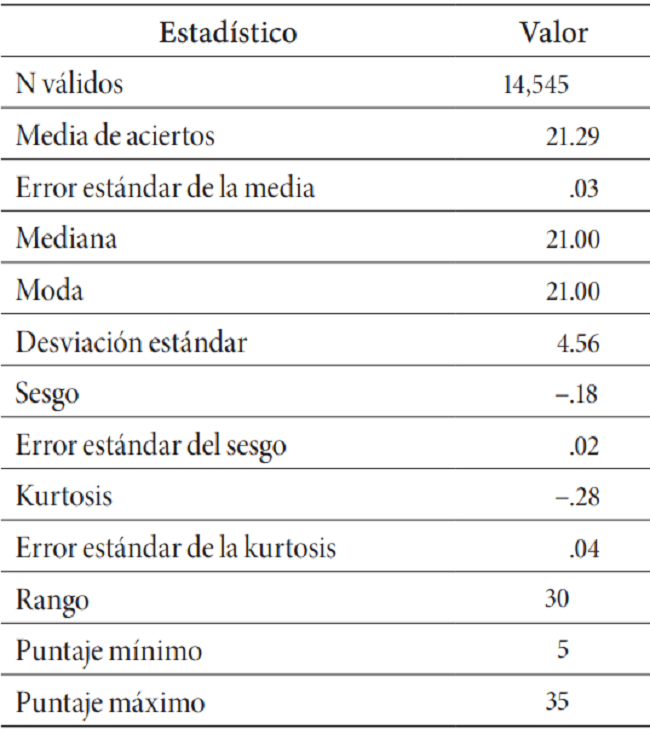 En la Tabla 2 se presentan los estadísticos descriptivos correspondientes a los puntajes que obtuvieron los evaluados en el EXEEBAS; se observa que el promedio de aciertos en el examen fue de 21.29 puntos de 37 posibles (57.5 por ciento), y los puntajes están concentrados cerca de la media.