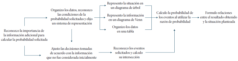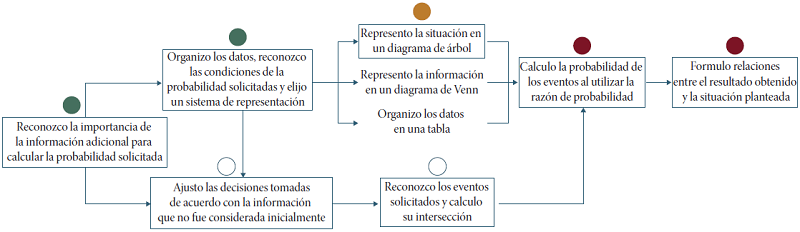 En las líneas que siguen se ejemplifica este procedimiento para el tema de probabilidad condicional, y el objetivo de aprendizaje “reconocer situaciones en las que es posible aplicar la noción de probabilidad condicional en distintos contextos y expresar la situación matemáticamente” (Díaz et al., 2017). En la Fig. 1 se presenta el grafo de criterios de logro de este objetivo de aprendizaje.