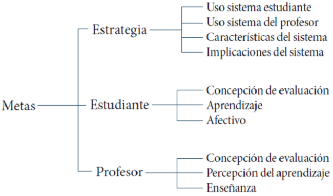 En la Fig. 3 se presentan los elementos básicos de esta estructura. Como puede verse, presenta tres categorías: la estrategia, el estudiante y el profesor. En cuanto a la estrategia, se identificaron y describieron sus usos por parte tanto del estudiante como del profesor, así como sus principales características, que surgen de la evidencia y sus implicaciones. Desde la perspectiva del estudiante, se describieron los efectos del uso de la estrategia en su concepción de la evaluación, su aprendizaje y motivación. Finalmente, desde el punto de vista del profesor, se describió cómo el uso de la estrategia tuvo efectos en su concepción de la evaluación, su percepción del aprendizaje y sus prácticas de enseñanza.