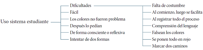 Finalmente, la tercera parte de la entrevista buscaba indagar sobre el uso de la estrategia por parte del profesor y de sus efectos en su trabajo. Para ello se plantearon los siguientes estímulos: “háblanos sobre las virtudes y defectos [que] consideras que el sistema de los semáforos tiene para tu práctica docente”; “¿incorporarías este sistema o una adaptación a tus clases habituales?, ¿cómo lo adaptarías?”.