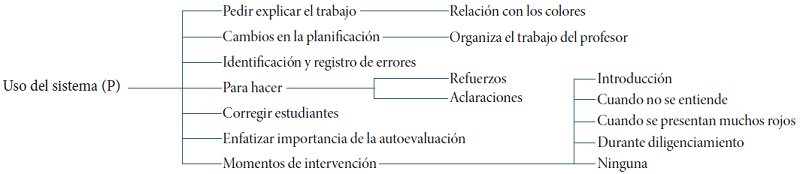 Los profesores manifestaron que la estrategia puede resultar muy versátil (Fig. 5). Les resultó útil para organizar mejor su trabajo de planificación, revisar las actividades, comparar su percepción con la de los estudiantes, planear cambios a futuro, identificar y registrar errores de sus estudiantes, así como corregirlos y proponer refuerzos cuando fue necesario. Los profesores también usaron la estrategia para que sus estudiantes reconocieran la importancia de la autoevaluación, y les solicitaron que explicaran su trabajo al compararlo con los colores que habían registrado en su diario. Por último, algunos profesores manifestaron que en la puesta en práctica de la estrategia fue necesario intervenir en algunas ocasiones: en la primera clase que se usó, o al momento de aplicarla, cuando los estudiantes no entendían su uso o cuando se registraban muchos rojos.