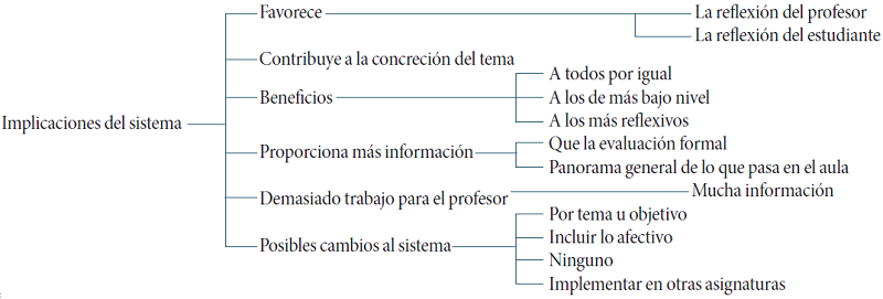 El uso de la estrategia tuvo varias implicaciones (Fig. 7): los profesores manifestaron que contribuyó a la concreción del tema y que promovió la reflexión, tanto por parte de ellos, como de sus estudiantes; algunos señalaron que benefició a los estudiantes, pero para otros, benefició a todos por igual. Algunos opinaron que benefició más a los de bajo desempeño, y para otros, favoreció especialmente a los estudiantes más reflexivos. Todos los profesores coincidieron en que la estrategia les dio más información que la evaluación tradicional, y que les brindó un panorama general de lo que pasó en el aula.