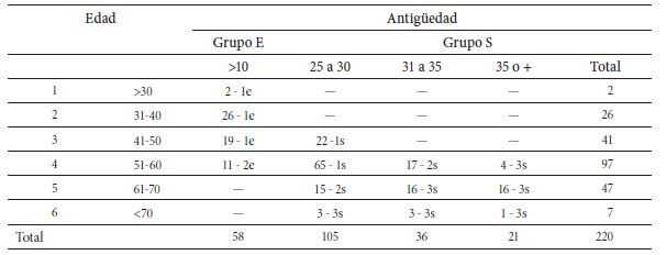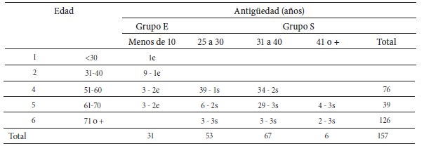 Para la UACh, en cada uno de los grupos se identificaron diferencias etarias significativas al momento del análisis, por lo que la muestra se fragmentó en subgrupos. El grupo E se dividió en dos subgrupos: subgrupo 1e -con los académicos de 50 años o menos (grupo más lejano a cumplir los criterios necesarios para el retiro, tanto por edad como por antigüedad); y el subgrupo 2e, en el que se ubican los académicos mayores de 51 años, que si bien no podrían acceder al retiro por antigüedad, sí lo harían por edad. Para fragmentar al grupo S se elaboró una tabla de frecuencias que cruza la variable edad con antigüedad por decenios.