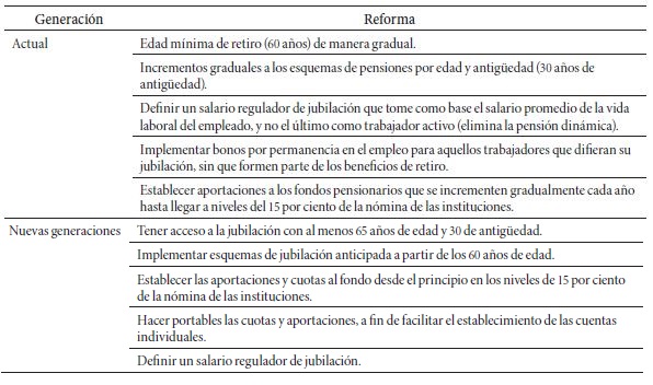 Los esquemas de retiro han impactado en la conformación de las plantas académicas. Se identifican dos tendencias: a) la jubilación anticipada; y b) la jubilación postergada. La primera se refiere al pago de pensiones al académico durante más tiempo del que éste ha cotizado (Bensusán y Ahumada, 2006). A partir de 2002, el gobierno federal ha destinado recursos económicos para apoyar reformas a los beneficios que las instituciones otorgan a sus trabajadores a través de la creación del Fondo de Apoyo para las Reformas Estructurales de las Universidades Públicas Estatales (FAREUPE). Su objetivo es que, las universidades que cuenten con un esquema propio o mixto de pensión modifiquen sus sistemas de retiro para disminuir los pasivos contingentes. Para acceder a los recursos de dicho Fondo, las universidades se comprometieron a reducir los déficit actuariales y los pasivos contingentes a través de cambios a los contratos colectivos de trabajo, a los estatutos y, en su caso, a las leyes orgánicas. El Cuadro 1 muestra los principales cambios que se han realizado, para las generaciones actuales y futuras:
