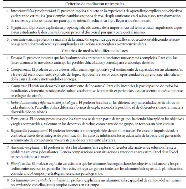 En la perspectiva de la teoría EAM, la mediación eficaz que realizan los docentes se ajusta a determinados criterios de mediación (CM) que promueven la modificabilidad cognitiva estructural del estudiante (Orrú, 2003). Tres de estos criterios son considerados universales, necesarios y favorables a la mediación: 1) intencionalidad y reciprocidad; 2) significado; y 3) trascendencia. En tanto, los nueve restantes son considerados diferenciadores, específicos de cada contexto: 1) desafío; 2) competencia; 3) compartir; 4) individualización y diferenciación psicológica; 5) pertenencia; 6) regulación y autocontrol; 7) alternativa optimista; 8) planificación y logro de objetivos; y 9) ser humano como entidad cambiante (Kozulin, 1999).