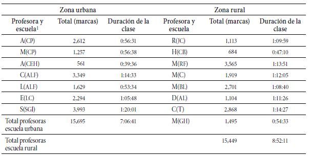 El proceso de categorización total del estudio fue de 31 mil 144 marcas de todas las categorías de un tiempo total de 15 horas, 58 minutos y 52 segundos de clases analizadas. Aunque el número de clases observadas en zona rural es levemente mayor al de zona urbana, así como el tiempo total de clases (casi 9 horas en escuelas rurales, y 7 en las escuelas urbanas de la muestra), se obtuvo un número semejante de marcas en ambas zonas, cercano a los 15 mil 500 en cada uno de los escenarios (Tabla 1).