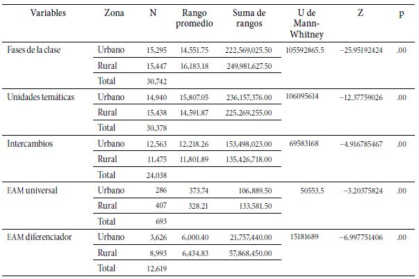 La distribución del tiempo de duración de fases, unidades temáticas, intercambios, EAM universales y EAM diferenciadores en las clases es significativamente distinto entre escuelas de zona rural y de zona urbana. Cabe señalar que esta diferencia también se encuentra al comparar los rangos promedios de todas las categorías entre todas las profesoras (prueba Kruskall-Wallis p<.001). En efecto, cada clase ajusta los tiempos, las actividades a desarrollar, la gestión de las conversaciones o intercambios al interior y las mediaciones para el aprendizaje autónomo a cada realidad directa y emergente de la clase. En tal sentido, ninguna clase es igual a otra (Tabla 2).
