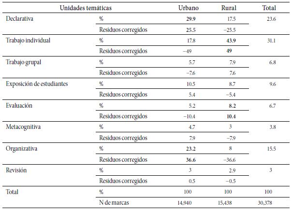 Las unidades temáticas observadas están asociadas al contexto sociocultural de las escuelas (Chi cuadrado [7, N=30,378] = 3523.766; p<.001), y la fuerza de dicha asociación es moderada (V de Cramer=.341). En relación con las más altas frecuencias de distribución porcentual y el valor más alto de los residuos tipificados de las casillas, se observa que la fuerza de la asociación en las escuelas de contexto urbano se caracteriza, en más de 50 por ciento de las clases, por unidades temáticas declarativas y organizativas; y, por su parte, las escuelas de contexto rural por unidades temáticas de trabajo individual y evaluación (Tabla 3).