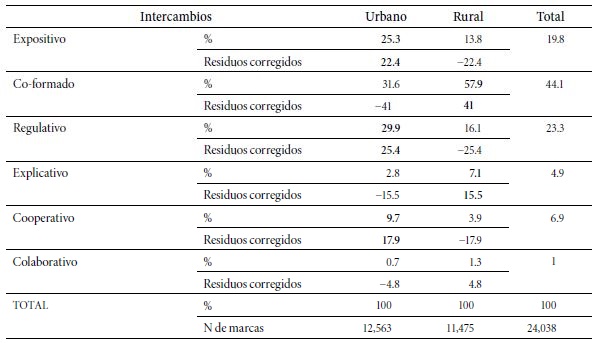 Los intercambios observados están asociados al contexto sociocultural de las escuelas (Chi cuadrado [5, N=24,038] = 2384.640; p< .001), y la fuerza de dicha asociación es moderada (V de Cramer=.315). En consideración de las más altas frecuencias de distribución porcentual y el valor más alto de los residuos tipificados de las casillas, se observa que, en las escuelas de contexto urbano, en más del 50 por ciento de la clase, la fuerza de la asociación se ubica en los intercambios expositivos, regulativos y cooperativos; por su parte, en las escuelas de contexto rural, el más alto porcentaje, y por lo tanto la mayor fuerza de la asociación, es con los intercambios de tipo coformado y explicativo.