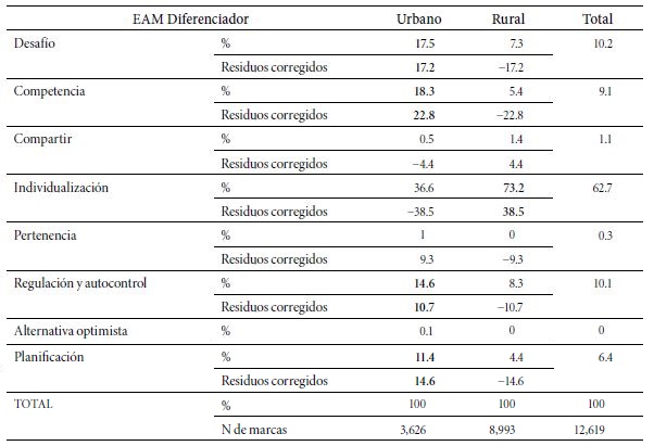Los criterios de EAM diferenciadores observados están asociados al contexto sociocultural de las escuelas [Chi cuadrado (7, N=12,619) = 1706.139; p<.001], y la fuerza de dicha asociación es moderada (V de Cramer=.368). Dadas las más altas frecuencias de distribución porcentual, y el valor más alto de los residuos tipificados, se observa que la fuerza de la asociación en las escuelas de contexto urbano en más de 50 por ciento de la clase está en los EAM diferenciadores desafío, competencia, regulación y autocontrol, y planificación; por su parte, en el contexto rural el mayor porcentaje y fuerza de la asociación se encuentra en el EAM diferenciador individualización (Tabla 5).