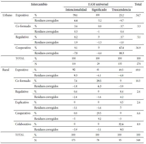 Los tipos de intercambio observados están asociados a los criterios de EAM universales (Chi cuadrado [6, N=274] = 117.284; p<.001), con fuerza de asociación moderada (V de Cramer=.463) en las escuelas de contexto urbano. Esta asociación significativa se repite en las escuelas de contexto rural (Chi cuadrado [10, N=348] = 269.833; p< .001) y la intensidad de la asociación es fuerte (V de Cramer=.623). En consideración de las más altas frecuencias de distribución porcentual, y el valor más alto de los residuos tipificados, se observa que, en el contexto urbano la fuerza de la asociación se encuentra entre: 1) el intercambio expositivo y EAM intencionalidad; y 2) entre intercambios cooperativos y EAM trascendencia. En el contexto rural el mayor porcentaje y fuerza de la asociación se encuentra en: a) intercambio expositivo y EAM intencionalidad; b) intercambio co-formado y EAM significado; y c) intercambio colaborativo con EAM trascendencia (Tabla 6).