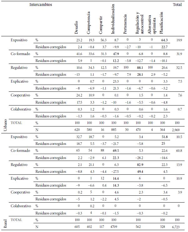Los tipos de intercambio observados están asociados con los criterios de EAM diferenciadores [EAMD] (Chi cuadrado [35, N=2,969] = 2187.609; p<.001), con fuerza de asociación moderada (V de Cramer=.384) en las escuelas de contexto urbano. Esta asociación significativa se repite en las escuelas de contexto rural (Chi cuadrado [25, N=6,723] = 3935.397; p<.001) con intensidad de la asociación moderada (V de Cramer=.342). Tomando en cuenta las más altas frecuencias de distribución porcentual y el valor más alto de los residuos tipificados de las casillas, se observa que, en el contexto urbano, la fuerza de la asociación se encuentra entre: 1) el intercambio expositivo y EAMD planificación; 2) intercambio co-formado y EAMD individualización; y 3) intercambio regulativo y EAMD regulación y autocontrol. En el contexto rural el mayor porcentaje y fuerza de la asociación se encuentra igualmente en: a) intercambio expositivo y EAMD planificación; b) intercambio co-formado y explicativo con EAMD individualización; c) intercambio regulativo y EAMD regulación y autocontrol (Tabla 7).