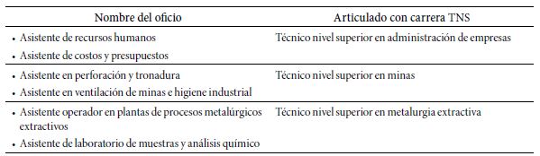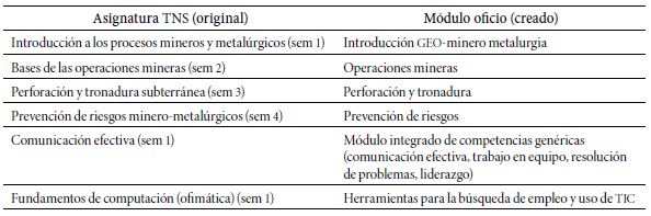 Diseño del oficio desde la carrera TNS. Mediante un análisis riguroso de los módulos o programas de asignatura definidos en el plan de estudios de la carrera de técnico de nivel superior, se identificaron los aspectos asociados a competencias procedimentales y de pertinencia para el oficio, seleccionando las asignaturas y módulos de la especialidad. Para cada carrera TNS se identificaron las capacidades declaradas en el perfil de egreso y se analizaron los programas de asignaturas orientadas a prácticas intermedias propias de la línea de formación troncal. Cada una de estas líneas de especialidad consta de un número específico de asignaturas que cruzan transversalmente el plan de estudios de la carrera. A partir de este análisis, se seleccionó la línea con mayor pertinencia al oficio articulado y se crearon módulos complementarios que permitieran dar cumplimiento al oficio en plenitud. A modo de ejemplo, en el Cuadro 3 se muestran las asignaturas de la carrera TNS en minas -y su ubicación temporal original- que sirvieron de insumos para la creación de módulos técnicos del oficio conducente a TNS.