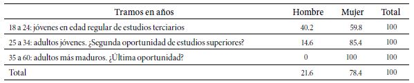 Cerca de 80 por ciento de los estudiantes son mujeres, principales beneficiarias del programa. En el Cuadro 2 se observa la presencia de tres grupos de edad bien definidos; el más numeroso es el de adultos jóvenes, seguido del grupo más joven. Aunque menor en cantidad, el grupo de adultos maduros tiene una presencia importante y son todas mujeres.