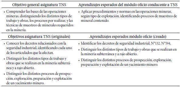 Desarrollo de los programas del oficio. Con base en el contenido programático de las asignaturas o módulo que sirvieron de insumo para la construcción del oficio conducente a TNS, y de su respectiva correspondencia con el perfil del egresado, se definieron las competencias y aprendizajes esperados del oficio afín; de esta manera, se buscó asegurar el desarrollo de las competencias prácticas necesarias para el ejercicio laboral del oficio. A modo de ejemplo, podemos observar la relación entre los aprendizajes esperados del módulo de Operaciones mineras del oficio y los objetivos de la asignatura TNS de Bases de las operaciones mineras, como se muestra en el Cuadro 4.