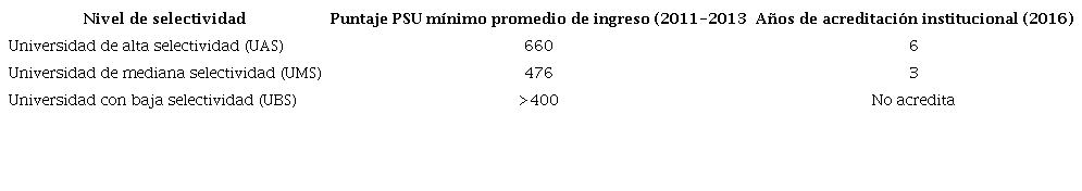 Los criterios de selectividad se indican en la Tabla 1 y son básicamente dos: el puntaje obtenido por los estudiantes en la Prueba de Selección Universitaria (PSU)4 y los años de acreditación institucional.5