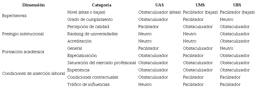 Es posible afirmar, a modo de hipótesis, que el acceso al mercado profesional para psicólogos recién titulados presenta asimetrías para quienes provienen de instituciones de diverso nivel de selectividad. En la opinión de los titulados, existen distintos factores que influyen en esta situación, los cuales se exponen en la Tabla 2. Cada uno de esos factores es percibido como un facilitador o un obstaculizador para la inserción en el mercado del trabajo, según se define a continuación.