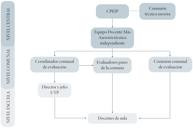 En el Reglamento la evaluación se define como un sistema formativo y obligatorio para todos los profesores del sistema de administración municipal, aunque hoy -y como resultado de la implementación de la ley 20.903 (que crea el sistema de Carrera y Desarrollo Profesional)- éste se ha hecho parcialmente extensible a los profesores de escuelas particulares que reciben aporte o subvención del Estado. El objetivo del sistema es otorgar oportunidades de mejora a través del dispositivo denominado Plan de Superación Profesional (PSP), que consistente en brindar oportunidades de perfeccionamiento para quienes obtienen malos resultados. La organización del sistema identifica tres niveles (Fig. 1): en el primero, el MINEDUC, a través del Centro de Perfeccionamiento e Investigaciones Pedagógicas (CPEIP), asume una función indirecta de financiamiento y desarrollo de normativas (Manzi et al., 2011); el segundo nivel es el comunal, y su tarea es la recepción y distribución de los instrumentos evaluativos e informes de resultados; finalmente, el tercer nivel, la escuela, sólo se concibe como espacio de aplicación. El proceso de evaluación tiene una duración aproximada de ocho meses, que va desde el registro y notificación (abril-mayo) hasta la entrega de los reportes de resultados. Durante este tiempo los profesores responden a cuatro instrumentos evaluativos: portafolio, pauta de autoevaluación, entrevista con un par y el reporte del director.