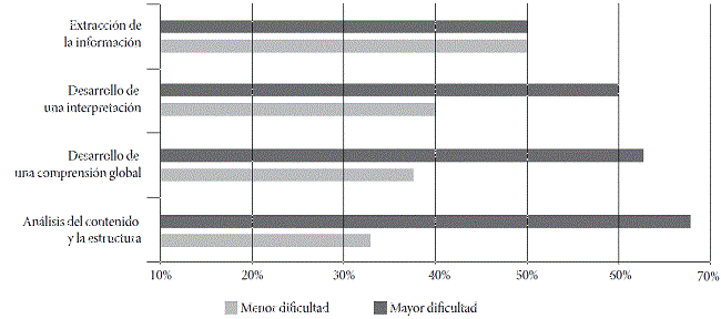 Respecto a la dificultad de las habilidades de comprensión lectora (Gráfica 1), la proporción de reactivos en el nivel de menor dificultad del conjunto extracción de la información (50 por ciento) es la mayor de todas, pues resulta 10 puntos porcentuales más alta que la de desarrollo de una interpretación (40 por ciento), que es el conjunto que le sigue. Por su parte, la diferencia entre desarrollo de una interpretación y desarrollo de una comprensión es mínima: sólo dos puntos porcentuales. La diferencia de dificultad entre estos dos tipos de habilidades y analizar el contenido y la estructura resulta mayor, pues existe una diferencia de seis puntos porcentuales en los reactivos de este último tipo de habilidad localizados en el nivel menor dificultad y los de desarrollo de una comprensión global; y, asimismo, una diferencia de ocho puntos entre los reactivos de ese mismo tipo de habilidad y los de desarrollo de una interpretación (Zamudio et al., 2012).