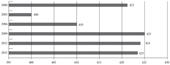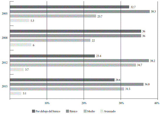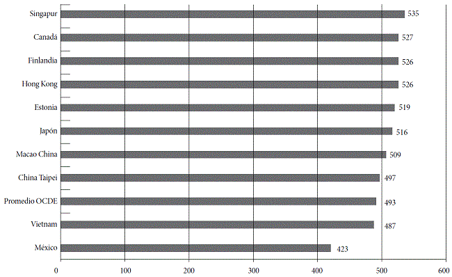 Cerca de 20 por ciento de los estudiantes de los países de la OCDE no obtienen la media en las competencias lectoras básicas, porcentaje que se ha mantenido estable desde 2009. Por ejemplo, en 2015 la media fue de 493 puntos, y los mejores puntajes correspondieron a: Canadá (527), Finlandia (526), Estonia (519) y Japón (516), todo ellos miembros de la OCDE; y Singapur (535), Hong Kong-China (527), Macao-China (509) y China-Taipei (497), países participantes. Los países con el índice más bajo fueron Grecia (467), Chile (459), Turquía (428) y México (423). Todo ello implica que México dista del promedio de la OCDE, ya que 29 por ciento de los estudiantes de la muestra global se encuentran en niveles superiores, lo cual contrasta con el 5 por ciento de los jóvenes mexicanos ubicados en dichos niveles. De manera particular, se observa que, de los países latinoamericanos, Chile cuenta con 15 por ciento de estudiantes en los niveles superiores (niveles 4 a 6) seguido por Uruguay con 12 por ciento. Por debajo de México se encuentran Brasil (407), Perú (398) y República Dominicana (358).