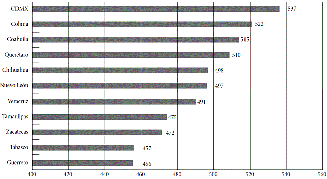 El logro educativo más favorable, de acuerdo con la evaluación más reciente de PLANEA, se encuentra en zonas de mayor ventaja socioeconómica en comparación con comunidades en condiciones más vulnerables, donde se presentan rezagos educativos importantes en lenguaje y comunicación. La evaluación por entidad federativa arrojó resultados cercanos al promedio nacional (500 puntos). En general, los niveles de logro alcanzados son bajos y demandan la atención urgente del sistema educativo. La Gráfica 4 ofrece el puntaje de la prueba por entidad y subraya el nivel obtenido de mayor a menor: las cuatro más altas, tres intermedias y cuatro con el menor puntaje.