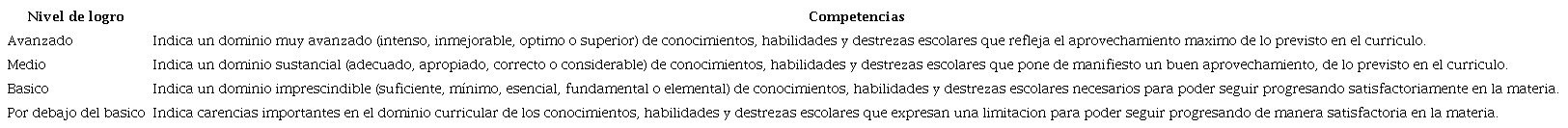 A fin de interpretar los resultados, se usó una escala de cuatro niveles que mide el logro educativo, es decir, una escala que busca categorizar las habilidades que posee el estudiante, o bien, lo que el alumno es capaz de hacer. La finalidad de estos niveles es suministrar un marco de interpretación común para los EXCALE y, al mismo tiempo, facilitar la comunicación de los resultados (INEE, 2006).