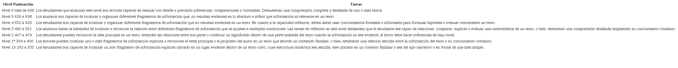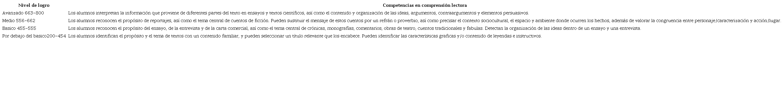 En el país, tres de cada diez estudiantes que finalizan la educación básica están en el nivel I (33.8 por ciento) lo cual indica que no han adquirido un aprendizaje completo de la asignatura de español, pues solo identifican, por ejemplo, definiciones y explicaciones de artículos de divulgación científica y la función y recursos lingüísticos en anuncios publicitarios. Asimismo, comprenden el tema de un ensayo e identifican la rima en un diálogo teatral, que son aprendizajes necesarios, pero insuficientes.
