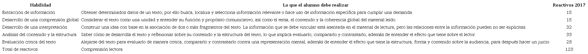 Las habilidades y conocimientos que se evaluaron en la comprensión lectora fueron: la extracción de la información, el desarrollo de una comprensión global, el desarrollo de una interpretación, el análisis del contenido, y la estructura y evaluación crítica del texto.