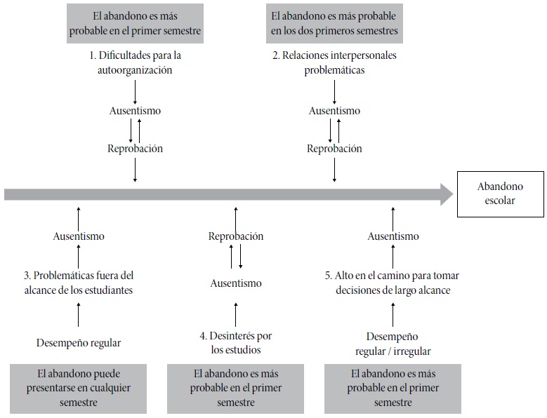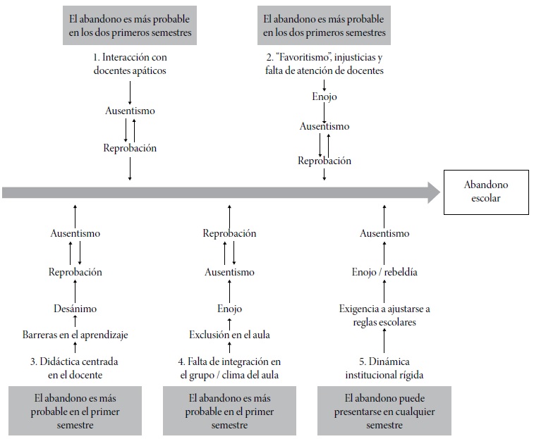Se ubicaron cinco factores individuales relacionados con el abandono y trayectorias escolares frecuentes (Esquema 1).