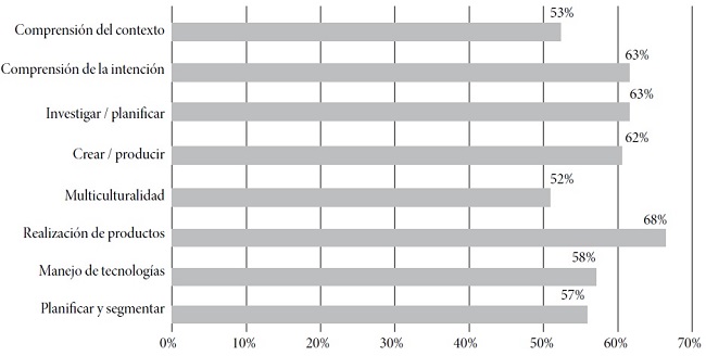 Como se puede apreciar, la comprensión del contexto, la multiculturalidad, el manejo de tecnologías y la planificación de los medios son las competencias que registran los menores porcentajes de valoración, y son las que están vinculadas a pensar, analizar y criticar; mientras que la realización de los productos, la comprensión de la intención comunicativa y la investigación y planificación de procesos comunicativos son las competencias que más se valoran, y están relacionadas con el hacer.