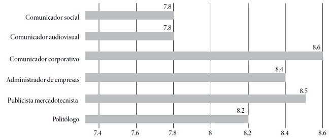 Por último, se presentaron seis opciones de perfiles laborales y se pidió a los encuestados valorarlos según la pertinencia dentro de las organizaciones en una escala de uno a diez. Los perfiles presentados se seleccionaron de páginas web de programas universitarios, pero los encuestados no sabían a qué programa pertenecía cada uno de ellos. Los perfiles y sus correspondientes carreras universitarias son los siguientes. El promedio de la valoración dada a cada perfil profesional se puede apreciar en la Gráfica 3.