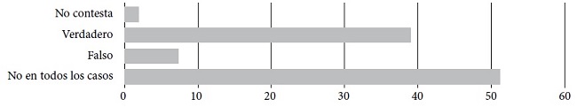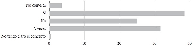 En cuanto a los signos identitarios (bandera, escudo e himno), 39.2 por ciento afirmó sentirse representado por estos elementos; sin embargo, 51.4 por ciento no los considera “en todos los casos” (Gráfica 4). Ante la evidencia de la naturaleza nacionalista del pensamiento del futuro profesorado, estos datos matizan los resultados anteriores cuando se les pregunta sobre la bandera, el escudo y el himno. Podría decirse que, dado que se manifiestan como nacionalistas, y consideran a España como una nación, esto no implica una fórmula unidireccional incuestionable, ya que defienden la existencia de una diversidad dentro de la unidad.