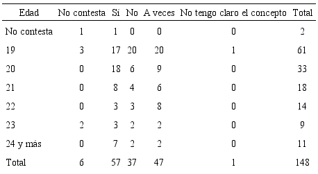 Los análisis de las tablas de contingencia ofrecen, a partir de la variable edad (19-24 años), resultados interesantes (ejemplo, Tabla 1), pues se observa una relación entre la respuesta positiva y la edad: el alumnado más joven se considera nacionalista según las circunstancias (obsérvese el número de respuestas de “a veces”). La explicación puede residir en el conocimiento, posiblemente adquirido en sus años de escolaridad, de una realidad territorial compleja en la que, bajo una unidad, reside y se reconoce una diversidad. A ello habría que añadir que en su mayoría han pasado los últimos años de maduración más significativa en un contexto político-cultural de crisis económica.