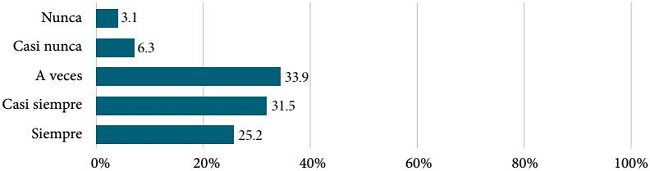 Por último, respecto a la pregunta sobre el uso de los recursos de los que disponen los profesores en el aula virtual basada en Moodle, los estudiantes señalan que la herramienta más usada es el control online (41 por ciento), que agrupa los rangos “a veces” y “siempre”, y en seguida se encuentra el empleo de foros virtuales, con 36 por ciento en la suma de los mismos parámetros de respuesta. Las redes sociales, el chat y las wikis son los recursos menos empleados por los profesores, según lo que declaran los encuestados. Estos datos se aprecian en la Gráfica 9.