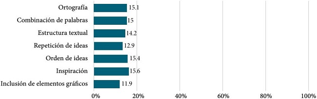 Llama la atención el rol primordial que se le otorga a la inspiración (15.6 por ciento), un componente que la literatura del área revela como insustancial para lograr que un texto cumpla con su propósito comunicativo (Flower y Hayes, 1981). Este aspecto está asociado a la representación social que se ha expuesto en otras investigaciones (ver, por ejemplo, Cassany, 2001) en las que se ha encontrado que la representación literaria se impone en la percepción de la escritura en los estudiantes universitarios.