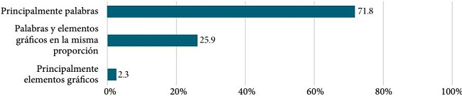 En cuanto al uso de recursos, en la Gráfica 3 se puede observar una preeminencia del modo verbal (“palabras”) en sus textos (71.8 por ciento) y sólo 25.9 por ciento combina modo verbal y visual en la misma proporción.