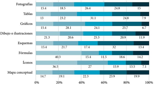 Con relación a la función de la dimensión de multimodalidad, se puede observar que los recursos se utilizan, principalmente, como ejemplo (37 por ciento) y para explicar un párrafo (31.2 por ciento). En segundo lugar, se establece la opción de reemplazo de sistema verbal (16.9 por ciento) y, por último, el uso decorativo (14.9 por ciento). Es interesante ver que existe un bajo uso de los elementos gráficos en esta última función, lo que plantea, en cierta medida, que los estudiantes declaran comprender que estos recursos tienen una función comunicativa específica, y no necesariamente estética. No obstante lo anterior, a la hora de escribir un texto señalan que le dan prioridad a las palabras.