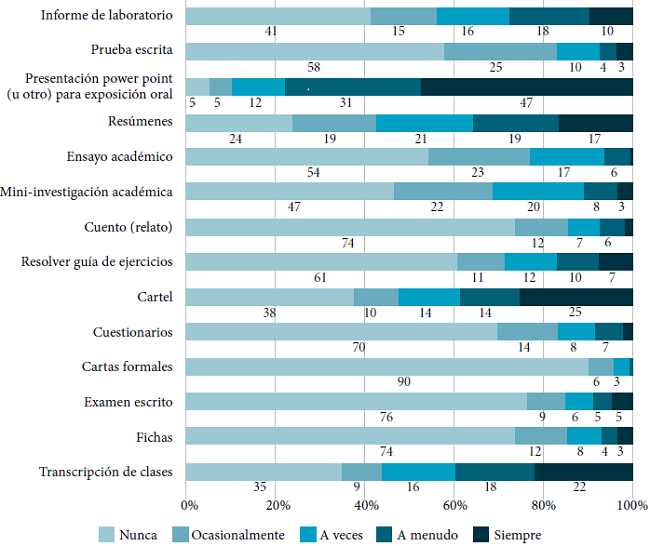 En este resultado se pueden considerar dos opciones: por un lado, las tareas de escritura que entregan los profesores se focalizan esencialmente en la evaluación del modo verbal, sin considerar otros elementos, y esto se refleja en lo que realizan los estudiantes; por otro lado, es posible que los profesores sí tengan en cuenta que la construcción de significado puede ser desarrollada mediante múltiples recursos (Kress y van Leeuwen, 2006), pero no ponen en práctica estrategias para trasmitirlo a sus estudiantes. En síntesis, lo que se observa en los datos es concordante con el paradigma logocentrista que señalan diversos autores (por ejemplo, Kress, 2010; Archer, 2010).