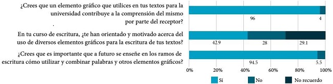 En cuanto a la segunda dimensión, se encontró que los estudiantes siguen anclados en la mirada logocentrista, sin poder despegarse del modo verbal como la forma exclusiva de construir significados (Bezemer y Kress, 2008; Archer, 2010). Los encuestados demostraron ser conscientes de la existencia de otros recursos semióticos, además del modo verbal, y reconocen que aportan significado y que facilitan la comprensión de lo que quieren comunicar; sin embargo, esto no lo aplican a sus escritos. Lo anterior representa un desafío no sólo para los estudiantes, sino también para los profesores que enseñan escritura, quienes deberán renovar y actualizar las tareas que proponen.