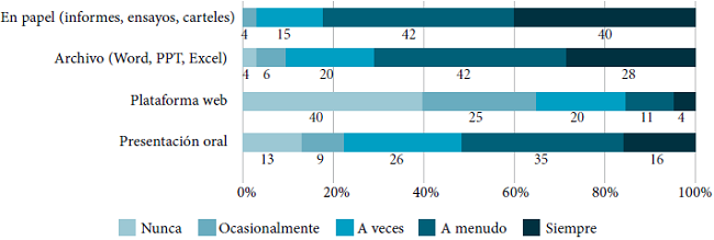 Respecto a esta categoría, se observaron diferencias significativas entre carreras: en la carrera de Obstetricia casi la totalidad de los estudiantes utiliza papel para entregar sus trabajos escritos; con relación al archivo digital y al uso de la plataforma web sobresale la carrera de Nutrición, donde altos porcentajes de estudiantes utilizan estos soportes. Sobre el empleo de la presentación oral, es en las carreras de Fonoaudiología, Nutrición, Obstetricia y Terapia ocupacional en las que más se utiliza este tipo de soporte para entregar los trabajos escritos.