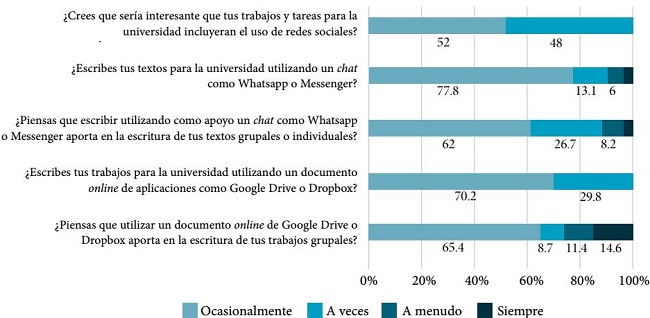 Con relación a la multimedialidad, a pesar de que la representación social de los estudiantes respecto al impacto tecnológico es positiva, siguen apegados a dispositivos tradicionales (el papel y la hoja en digital) para entregar sus tareas escritas, dejando de lado las potencialidades de otro tipo de plataformas. Por lo anterior, es necesario no limitar el uso de las tecnologías, es decir, superar el concepto técnico de las TIC (Cobo, 2016). En el caso de las redes sociales, la representación social respecto de su uso en trabajos y tareas prácticamente se divide en partes iguales. Dado que hay una tendencia al alza en el uso de herramientas de escritura colaborativa online (por ejemplo, Google Drive), las cuales usan el chat para la coordinación de actividades y la redacción, esto sugiere la importancia de usar recursos mediales que posibiliten la creación en conjunto y la convergencia de múltiples medios. Así, los profesores podrían alfabetizar con mayor propiedad a sus alumnos sobre estos aspectos. Una de las actividades que se podría generar es el uso de la plataforma de Drive de Google que permite interactuar a los profesores con sus estudiantes en la escritura.